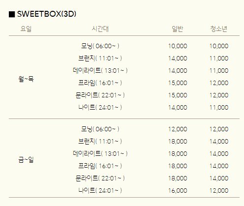 각 영화관마다 좌석 및 요일에 따라서 영화요금이 조금씩 차이를 보이고 있습니다. 홍성 cgv도 마찬가지로 주중 및 주말 요금이 다르게 적용되고 있으며 2D, 3D, SWEETBOX 요금이 다르다는 점 참고하시기 바랍니다.