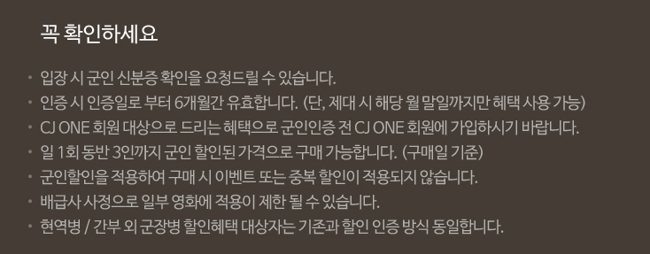 국방의 의무를 담당하는 군인들에게 보다 저렴한 가격으로 영화관람을 할 수 있도록 한 기획은 정말 좋은 취지인 것 같다.