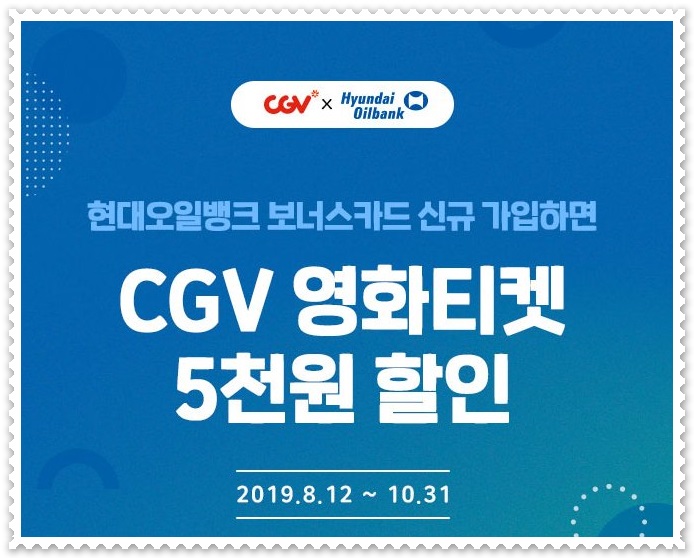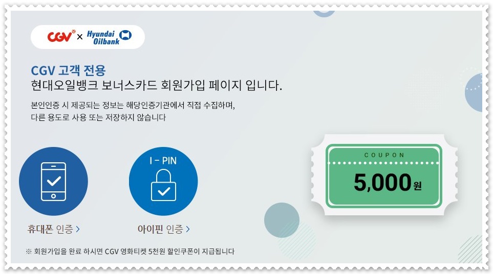현대오일뱅크에서 보너스 카드를 신규 가입하면 cgv 영화티켓 5천 원 할인 티켓을 제공한다고 합니다.