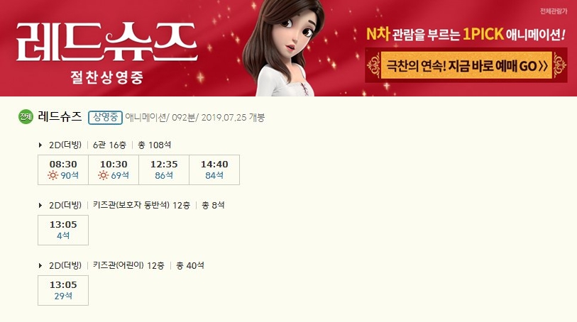 7월 17일 개봉한 라이온 킹은 오늘 총 4편의 상영이 예정되어 있습니다. 방학을 맞이하면서 더욱 많은 사랑을 받고 있습니다.