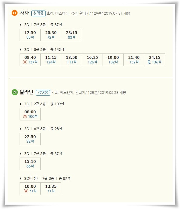 총 7편의 영화가 현재 상영 중입니다. 최근 개봉작부터 꾸준히 사랑받고 있는 영화인 알라딘이 눈에 띄는 것 같습니다.