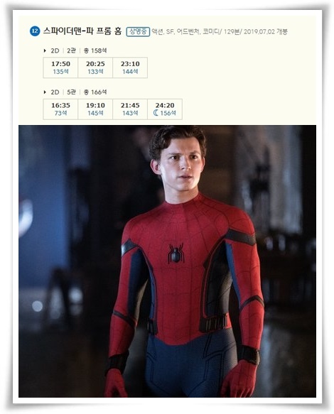바로 스파이더맨 파 프롬 홈인데요. 라이온 킹이 개봉하면서 예매율 2위로 내려왔지만 여전한 인기를 얻고 있는 작품입니다.
