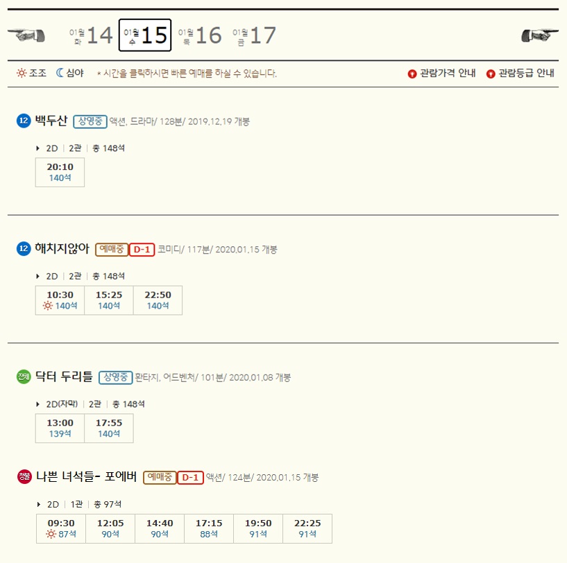 현재 예매순위에서 1위를 달리고 있는 닥터 두리틀을 비롯하여, 백두산, 해치지 않아, 나쁜 녀석들이 상영 중입니다.