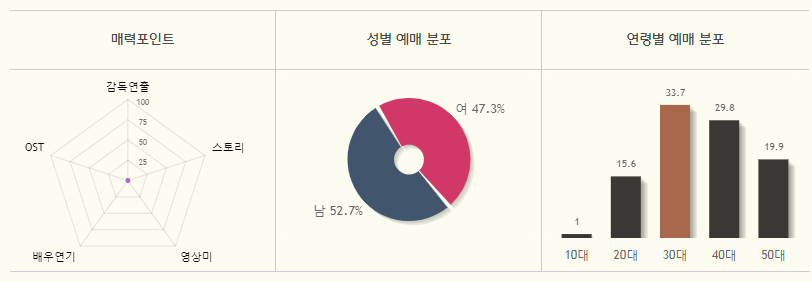 사전 예매부터 예매순위 1위를 기록하면서 많은 관심을 받고 있는데요 30대부터~50대까지 다소 연령층이 높은 사람들이 관심을 많이 갖고 있는 것이 특징이라 할 수 있습니다.
