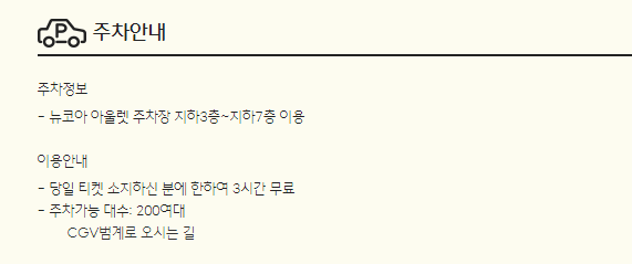 범계 cgv 주차정보를 살펴보면 cgv가 입점해 있는 건물인 뉴코아 아울렛에 주차가 가능하도록 되어 있습니다. 당일 영화 관람객의 경우 3시간까지 무료주차가 되기 때문에 영화 관람을 하는데 주차 걱정을 하지 않아도 될 것 같습니다.
