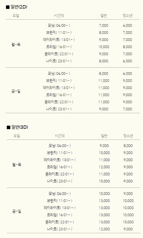 다만 한 가지 차이점은 롯데시네마의 경우 조조 요금을 제외하고 하루 요금이 동일한데 비하여 cgv의 경우 모닝, 브런치, 데이라이트, 문라이트 등 시간대별로 다르기 때문에 시간대를 잘 선택한다면 롯데시네마가 조금은 저렴하다고 할 수 있습니다.