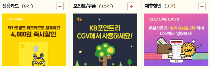 신용카드, 포인트 쿠폰, 제휴 할인 등을 통해 정상 가격보다 할인된 가격에 관람할 수 있으니 영화 관람 시 위와 같은 혜택을 꼭 받으시기 바랍니다.