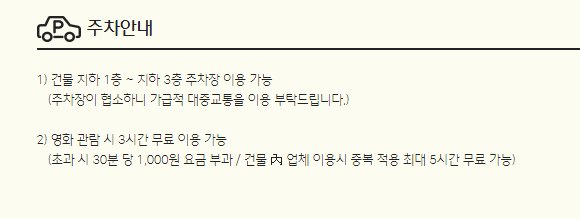 뿐만 아니라 당일 영화 관람시 3시간까지 무료주차를 제공하고 있어 걱정 없이 영화를 관람할 셔도 좋을 것 같습니다.