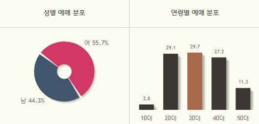 예매 분포를 살펴보면 여성 관객들이 남성들보다 많은 관심을 보이고 있으며 20대~40대까지 골고루 관람을 하고 있는 영화라고 합니다.