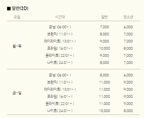 CGV만의 특징이라 할수 있으며 주중 일반 상영관 기준이며 3D 영화 및 좌석에 따라 관람요금이 다를수 있는점 참고하시기 바랍니다.