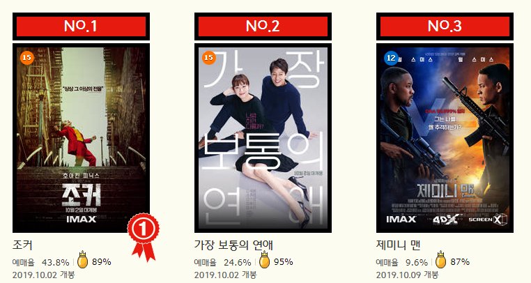 현재 메가박스, 롯데시네마, cgv를 통틀어서 개봉작중에서 영화예매 순위를 살펴보면 조커, 가장 보통의 연애, 제미니 맨 등이 예매순위 1, 2, 3위를 기록하고 있습니다.